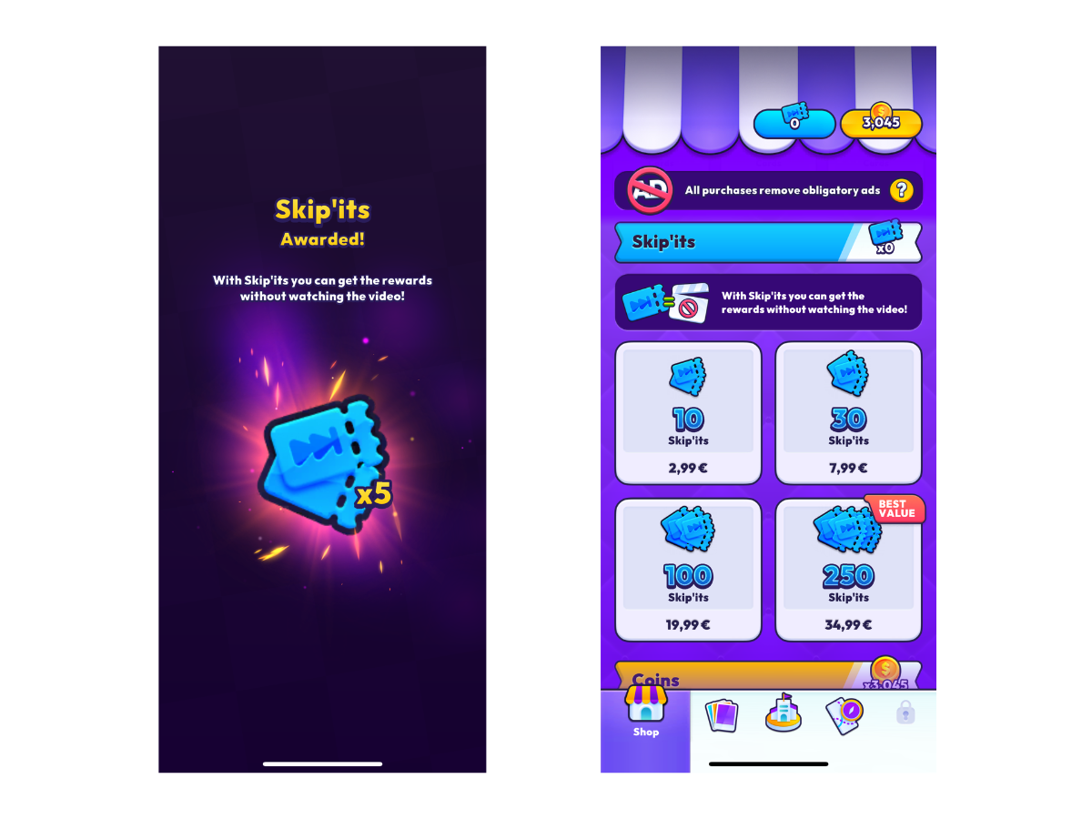 So, skip-its come as a convenient way to increase the revenue per reward claimed by allowing users to make an IAP transaction rather than trade in their time (needed to watch a rewarded video ad).