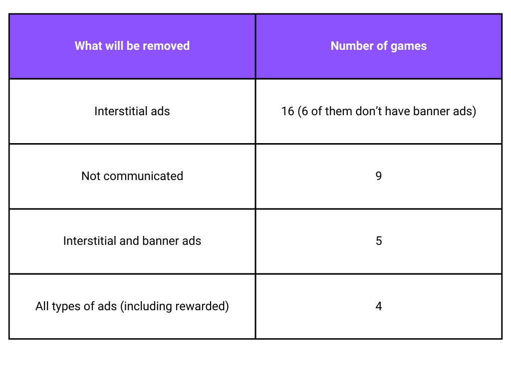 Lastly, as listed in the table, 5 games say they will remove both interstitial and banner ads when the No ads purchase is made, while the biggest group of games is the one that offers to remove only interstitial ads with this purchase (although 6 out of 16 of them don’t have banner ads in the first place).
